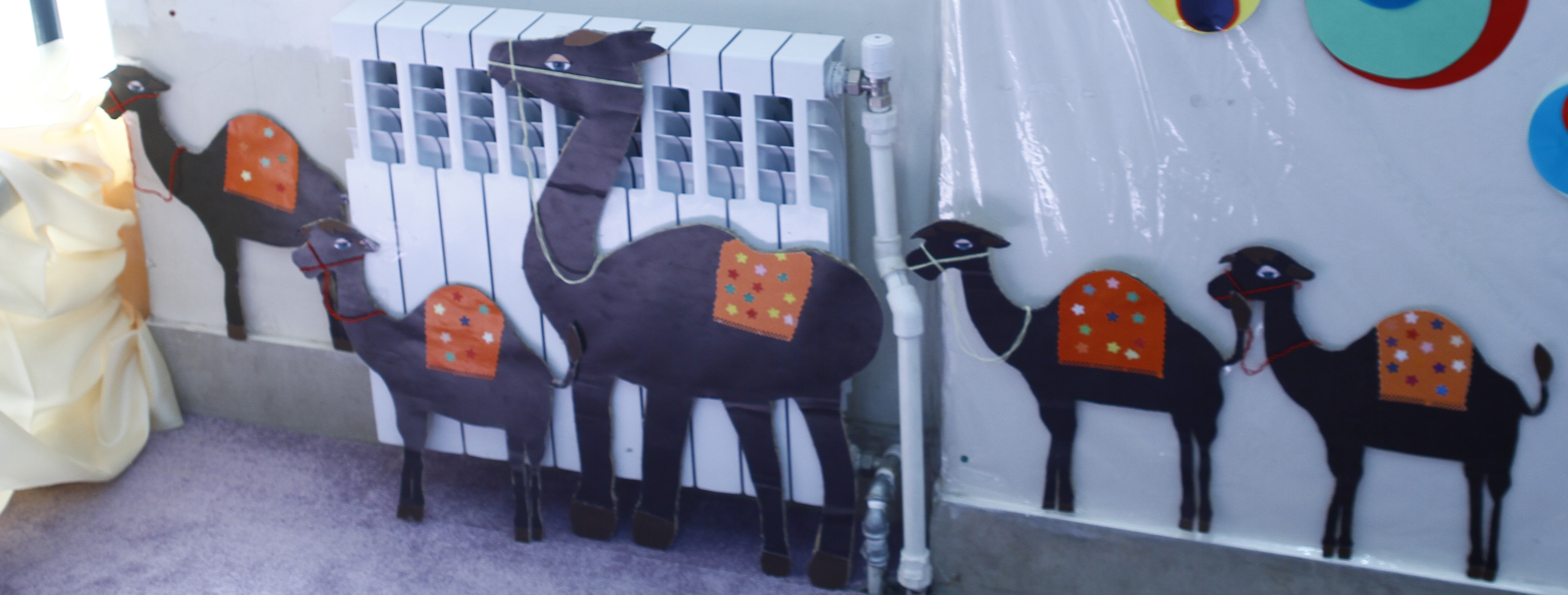 (بچه ها شترهایی که از قبل آماده کردند و بیرون می آورند و ادای سوار شدن در می آورند و چند بار، دور کلاس می چرخند)