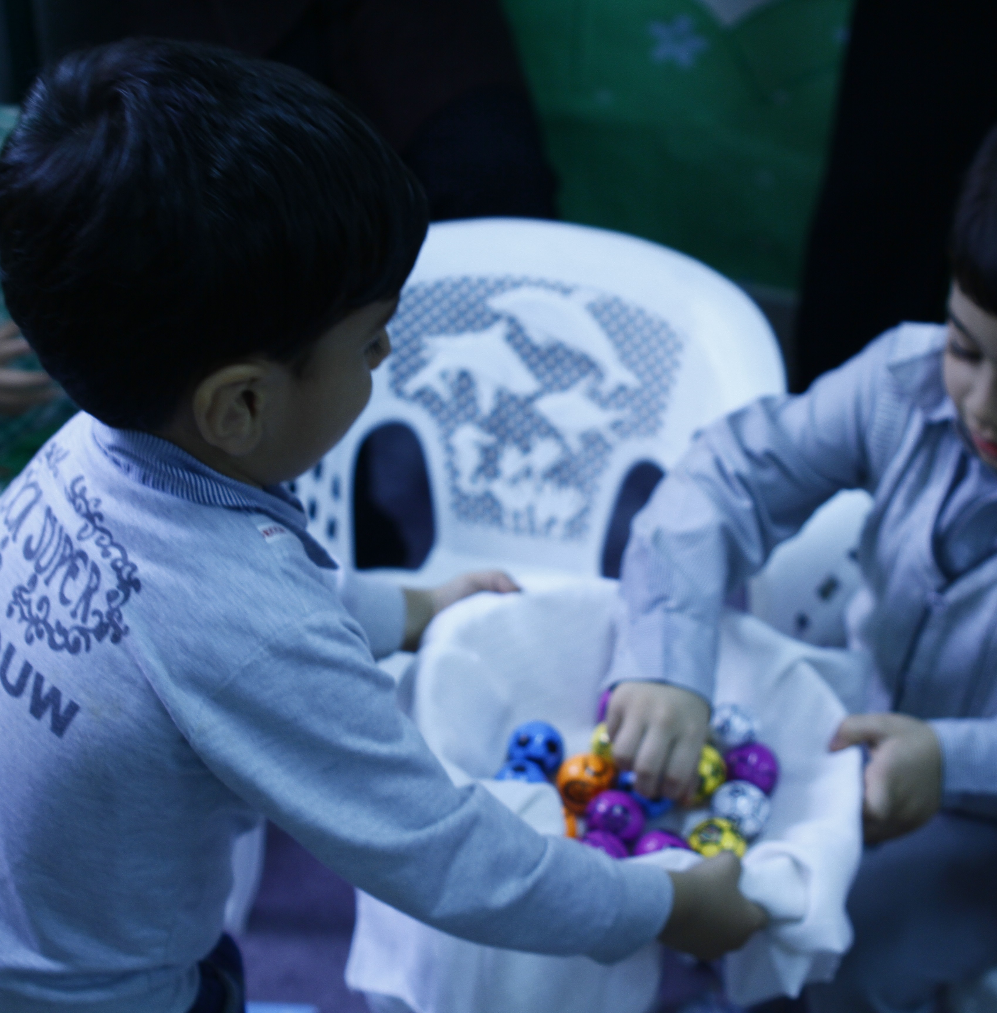 (در اینجا یه نوا پخش می شود و کمک مربی ها حباب رو سر بچه می ریزند و یک نفر دیگر از دور روی سر بچه ها شکلات می ریزد.)