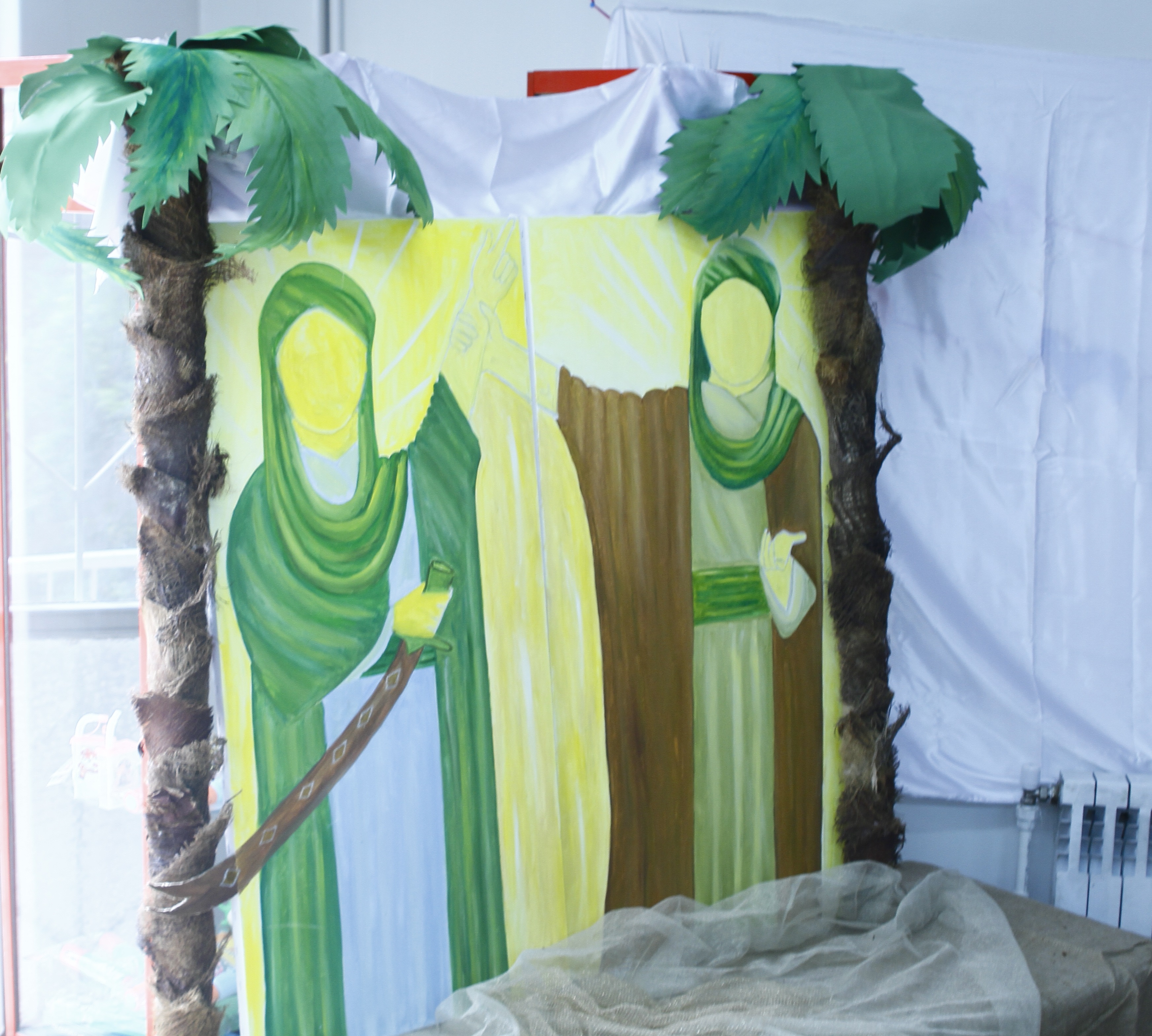 (صحنه ی پیامبر که دست امام علی علیه السلام را بالا گرفته اند تا الان پوشانده شده. پرده کنار می رود)